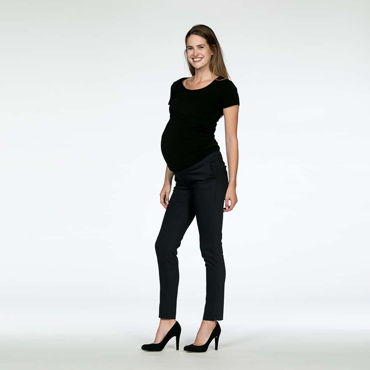 Superschöne Umstands-Business Hose mit seitlichen Taschen und leichtem Glanz. Eine Basic-Hose mit einer toller Passform für die Zeit der Schwangerschaft und danach, die zu allen Looks gut zu kombinieren ist!