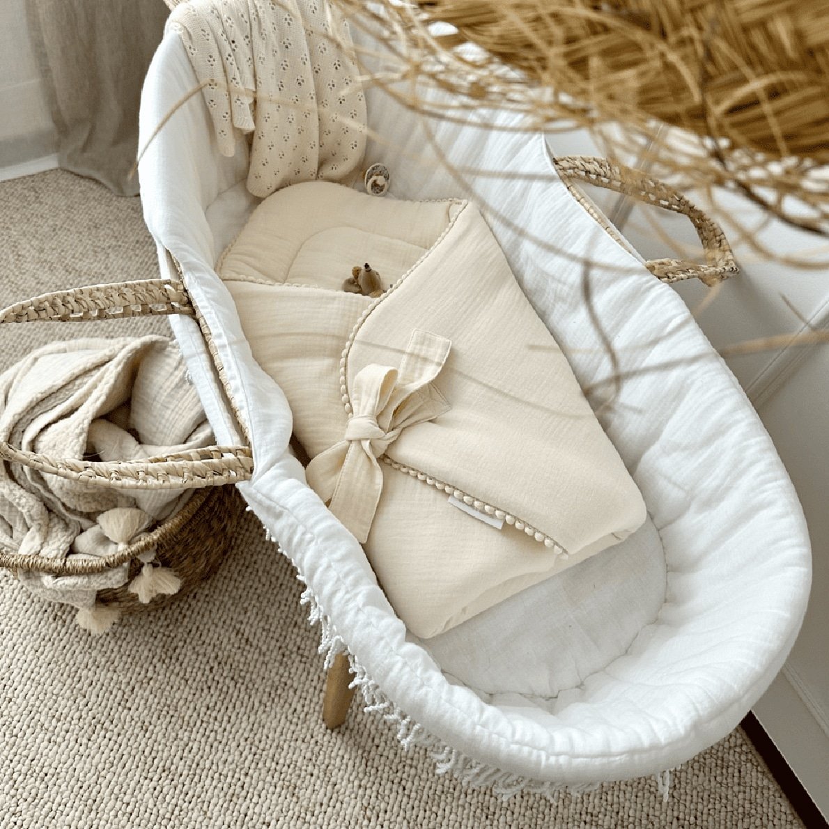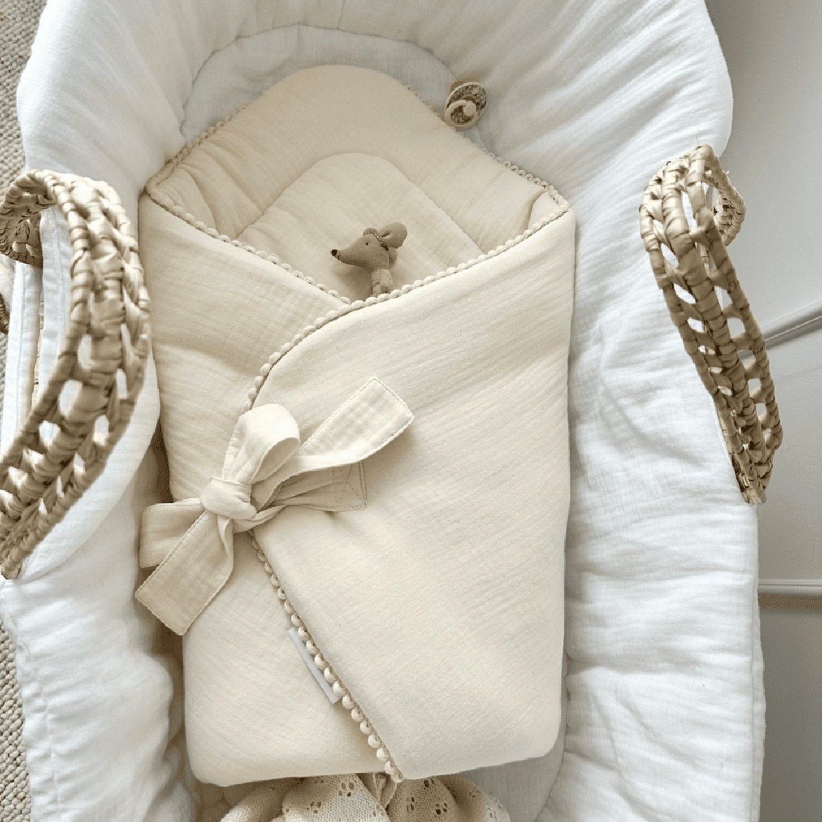 In dieser wunderschönen Einschlagdecke schläft Euer Baby bequem und sicher ab dem Tag der Geburt. Die kleine „Babytüte“ besteht aus weichem Musselin in einer Gots-zertifiziertem Baumwolle und die Ränder sind wunderhübsch verziert. Das Einschlagtuch garantiert Eurem Baby Sicherheit, denn die enge Umhüllung simuliert die Gefühle des Babys im Bauch der Mutter. Die „Babytüte“ legt sich sanft um den Körper des Babys, so dass es sich schnell beruhigt und einschläft. Es ist ein multifunktionales Produkt und kann als Schlafsack, warme Decke oder als Unterlage verwendet werden. Die Schleife ermöglicht eine perfekte Anpassung an die Bedürfnisse und Größe Eures Babys. Diese Einschlagdecke ist die ideale Geschenkidee für werdende Eltern.