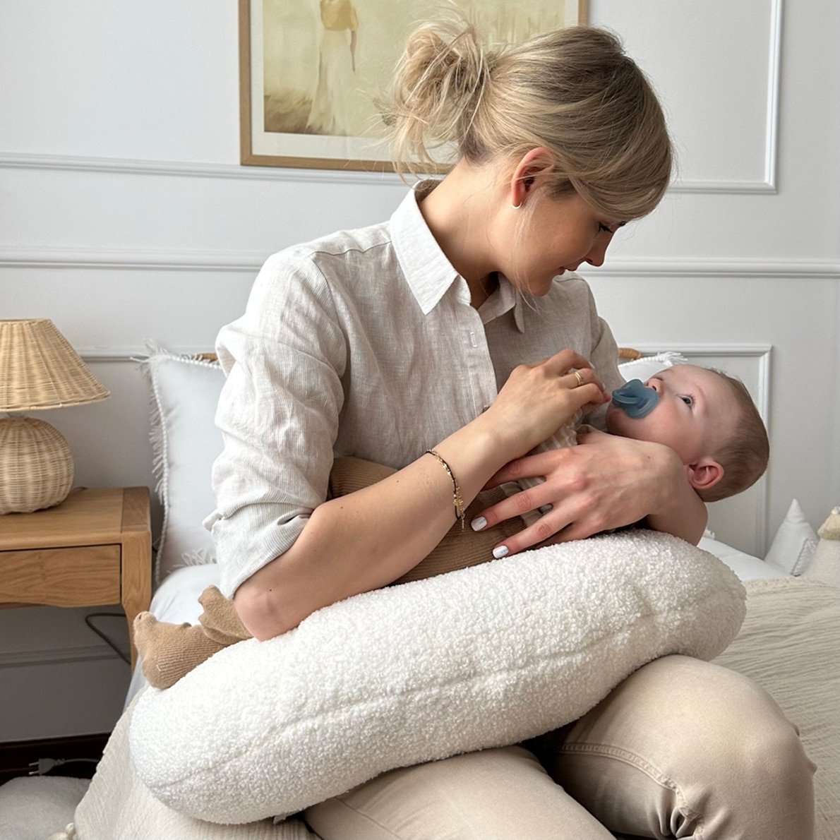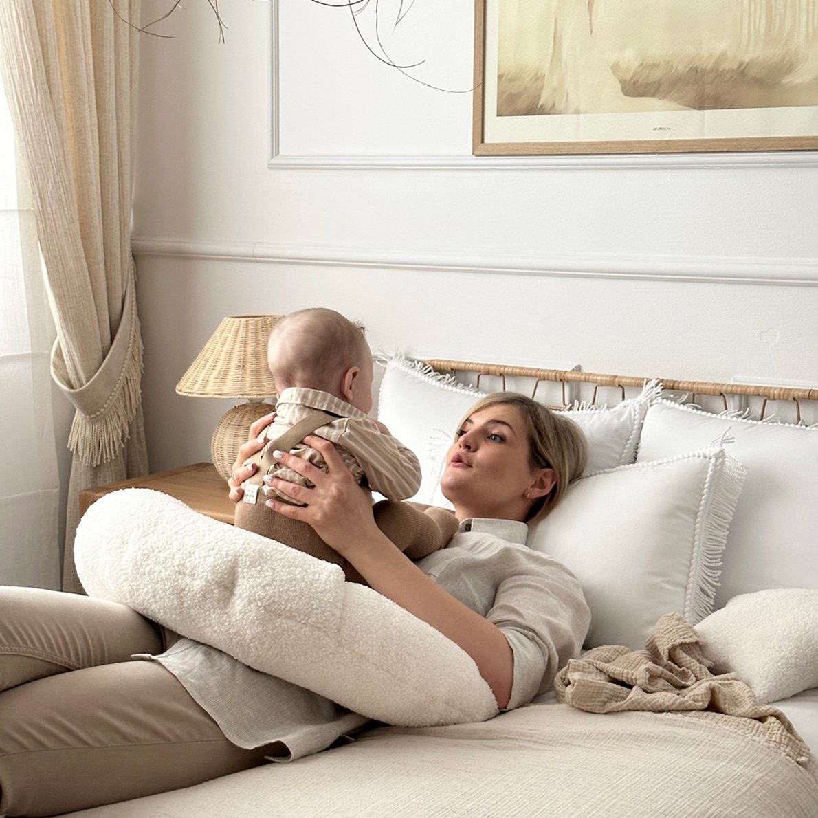 Das Stillkissen Croissant in Boho Bouclé Vanilla ist das perfekte Kissen für stillende Mütter. Es ist sehr bequem und passt sich super an, um Mutter und Baby zusätzlichen Komfort zu bieten und zu unterstützen. Das vanillefarbene, vielseitig einsetzbare Hörnchenkissen ist aus modischem Teddyboucle-Stoff gefertigt.