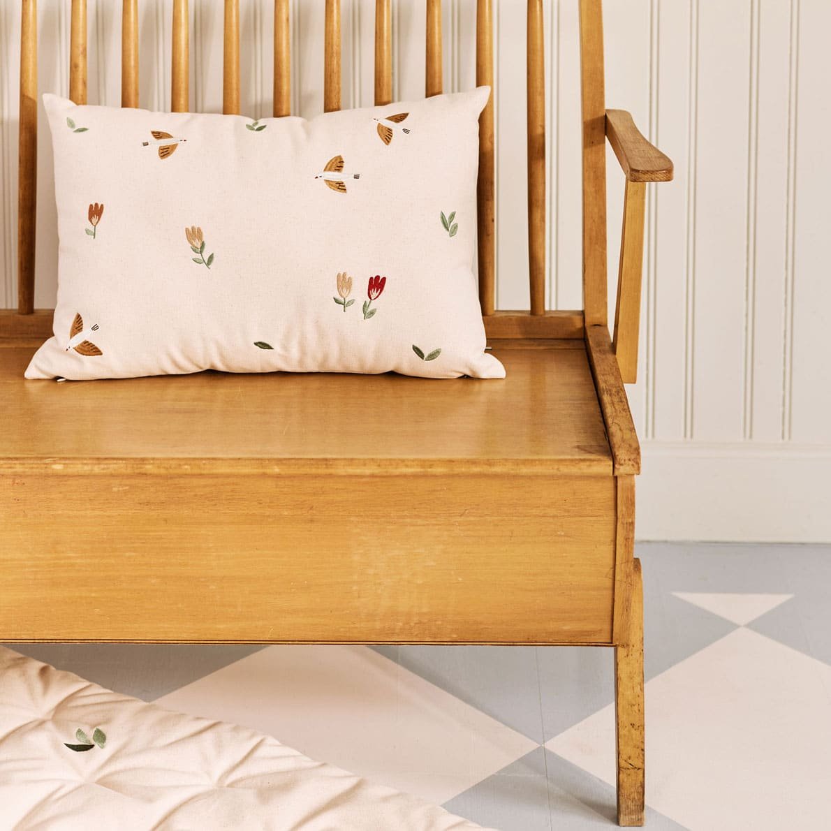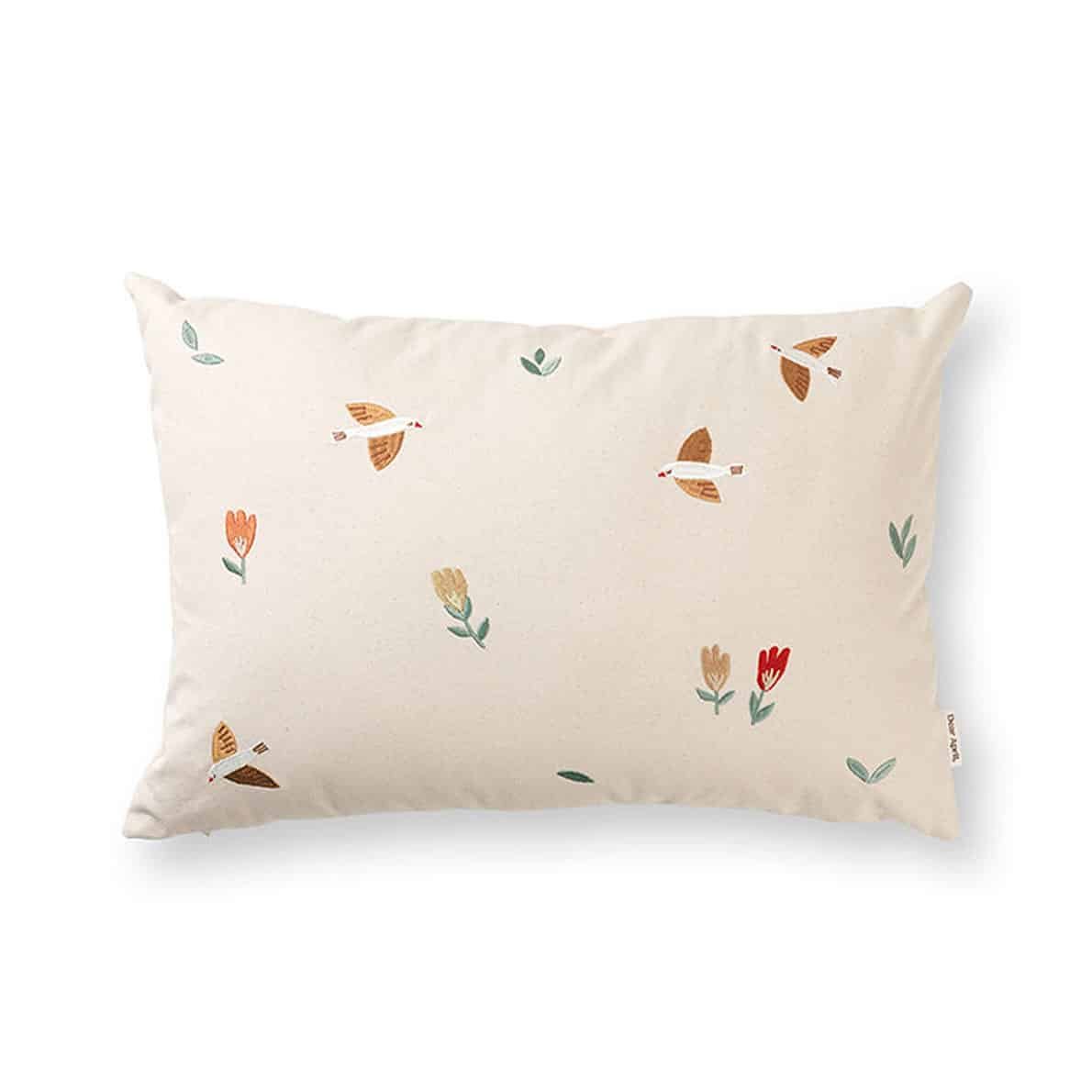 Das Kissen passt wunderbar zur bestickten Songbirds-Spielmatratze und dem Songbirds-3er pack Spielzeug von Dear April.