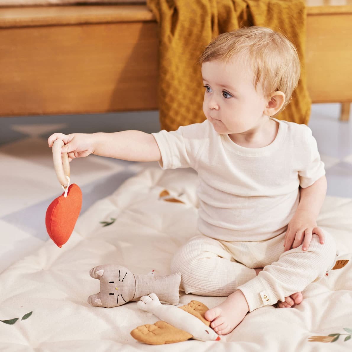 Die exklusive Herzrassel mit Beißring von Dear April eignet sich ideal für Euer Baby zum spielen und zudem regt die Glocke im Herz die Sinne Eures Babys an. Das Spielzeug ist aus umweltfreundlichem, natürlichem Leinen gefertigt.