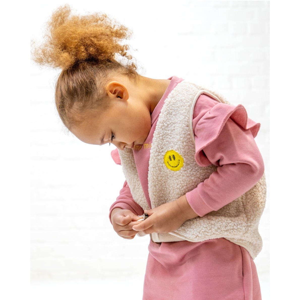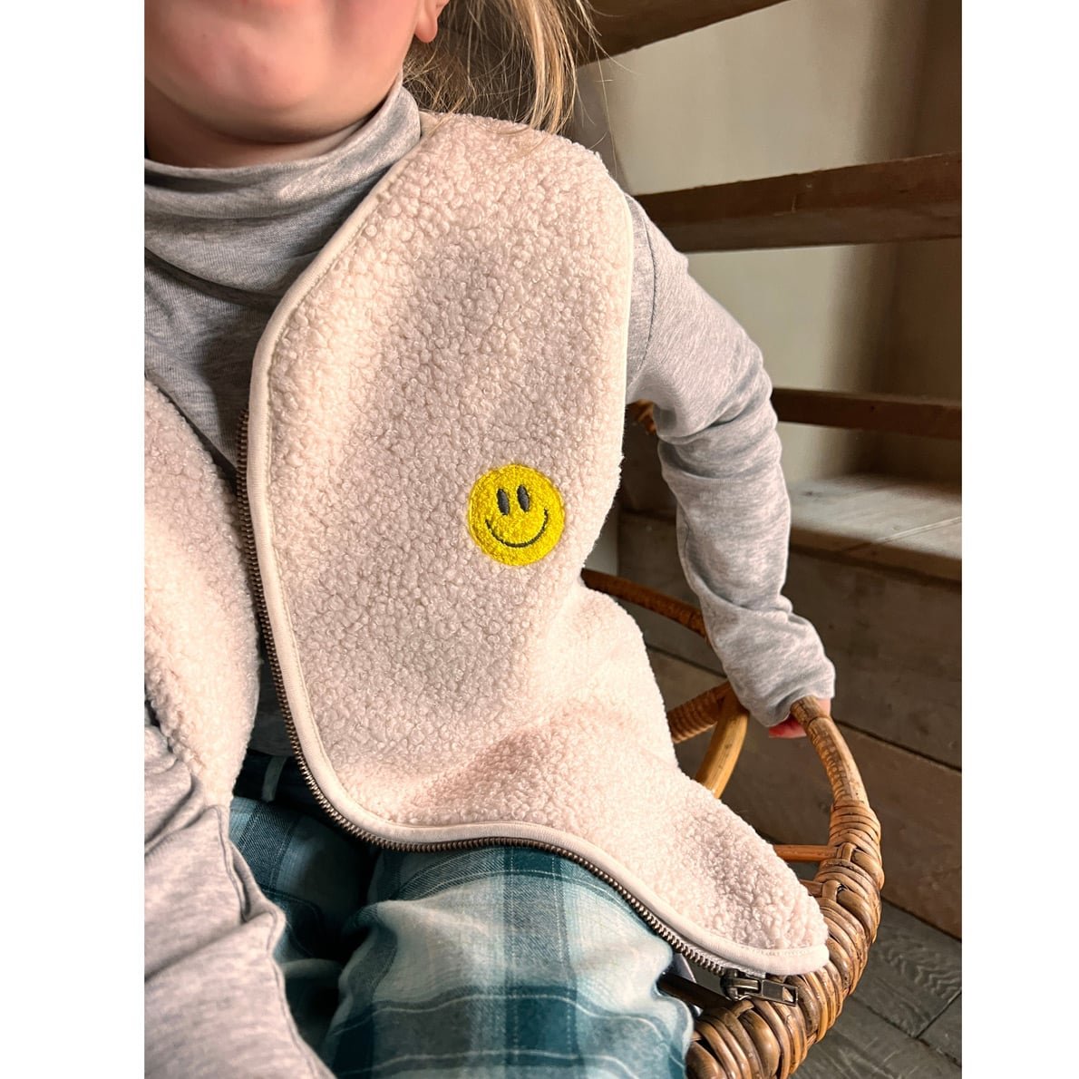 Diese ärmellose Teddyweste hat eine kleine Smiley-Stickerei auf der Vorderseite. Sie ist 100% kuschelfest, perfekt um Eure Kids an kühleren Tagen warm zu halten – oder an jedem anderen Tag, denn sie fühlt sich an wie eine warme Umarmung!
