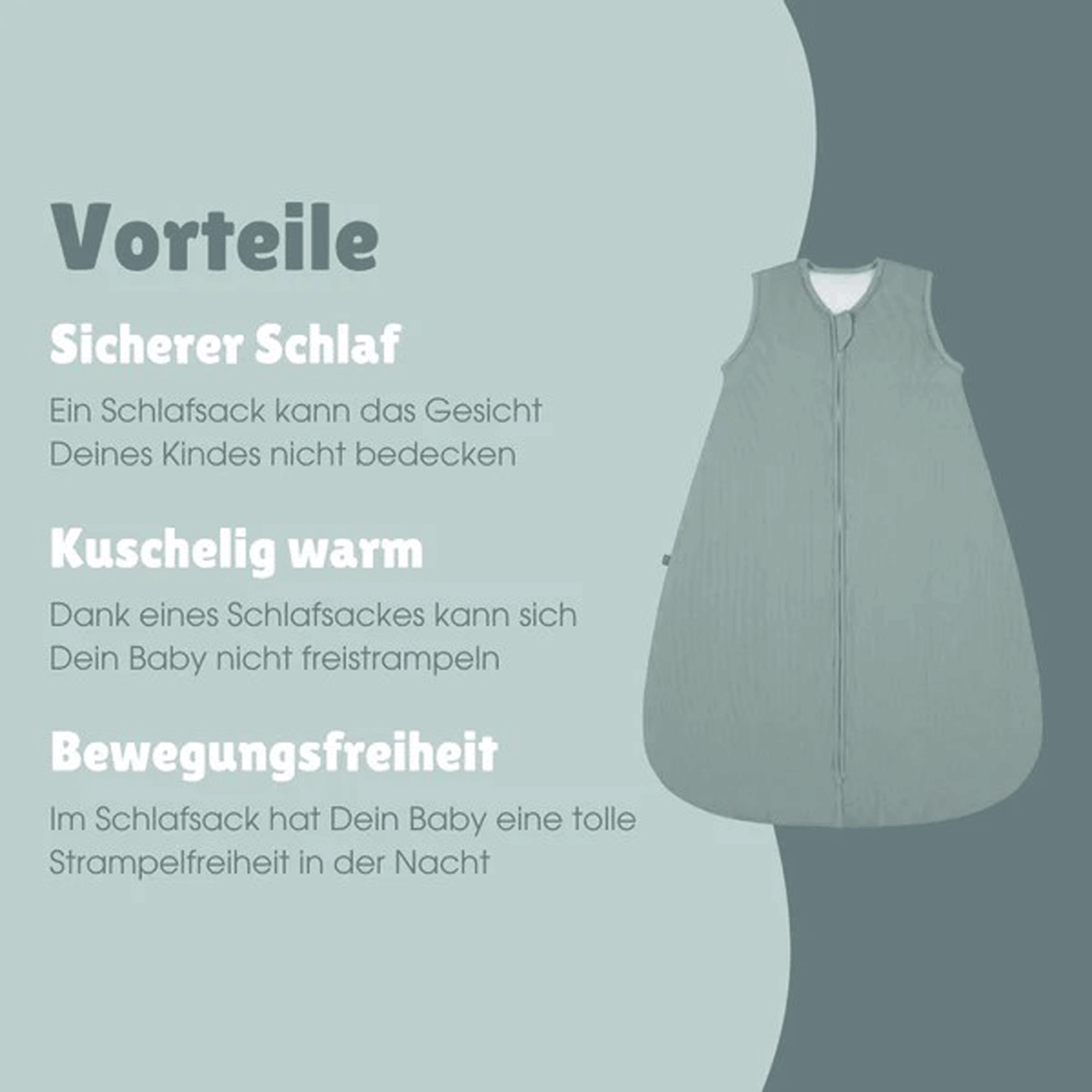 Die Babyschlafsäcke bestehen aus 100% Bio-Baumwolle. Diese ist besonders angenehm zur sanften Babyhaut und zeitgleich sehr atmungsaktiv und strapazierfähig. Durch den Komfort-Sicherheits-Reißverschluss lässt sich der Schlafsack kinderleicht von oben nach unten öffnen. Dadurch ist auch das Wickeln in der Nacht kein Problem mehr. Außerdem wird das Kinn des Babys durch den Zwickel am oberen Verschluss geschützt. Der Schlafsack hat weich eingefasste Hals- und Armausschnitte ohne störende Etiketten.