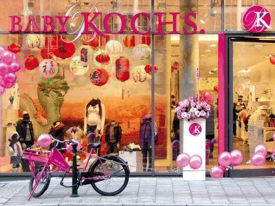 Der Umzug zum Wehrhahn 35 und die Geburt von Baby Kochs: Als eines der ersten Geschäfte in Deutschland führt Baby Kochs alles rund ums Baby und Kind: Babyausstattung, Kindermode, Kinderwagen, Kindermöbel, Spielwaren