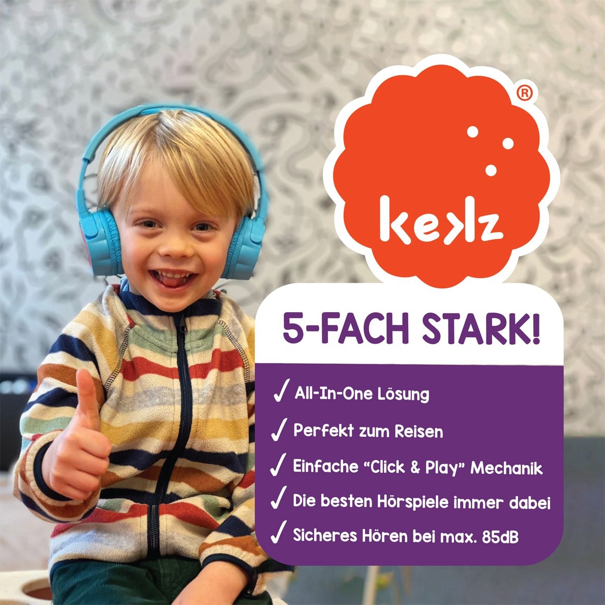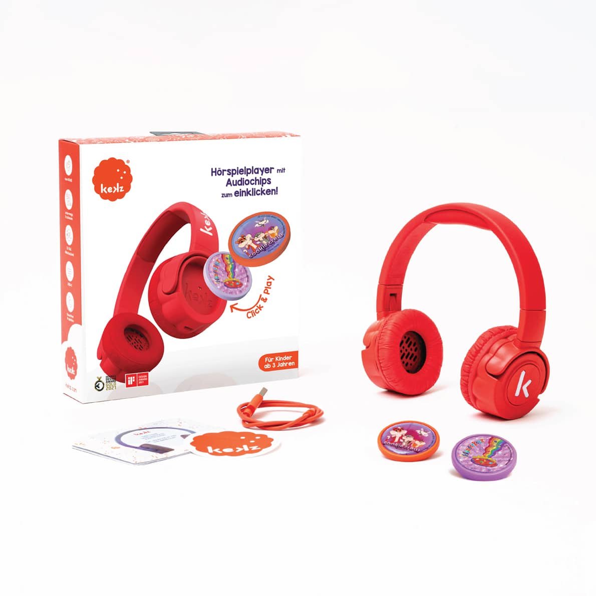 Der kabellose Kekzhörer® gibt Kindern die volle Kontrolle über ihre Lieblingsmusik, Hörspiele und -bücher – unabhängig vom Handy der Eltern und ohne Ablenkung, ohne Bildschirm und ohne externe Audioquelle wie Handys oder Tablets. Einfach Kekz in den Kekzhörer klicken und los geht‘s. Die perfekte kindgerechte mediale Unterhaltung für Kinder zwischen 3 und 7 Jahren, zuhause und unterwegs.