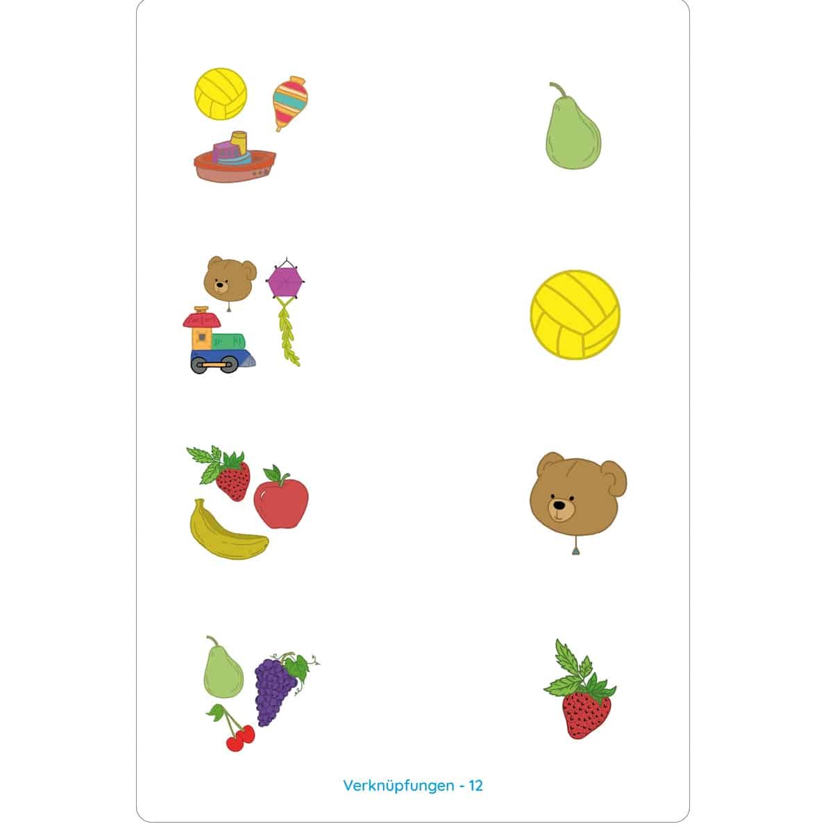 - Logisches Denken: Die Kinder werden dazu angeregt, Zusammenhänge zwischen verschiedenen Objekten, Kontexten, Mustern oder auch Bildteilen zu erkennen und richtig zuzuordnen