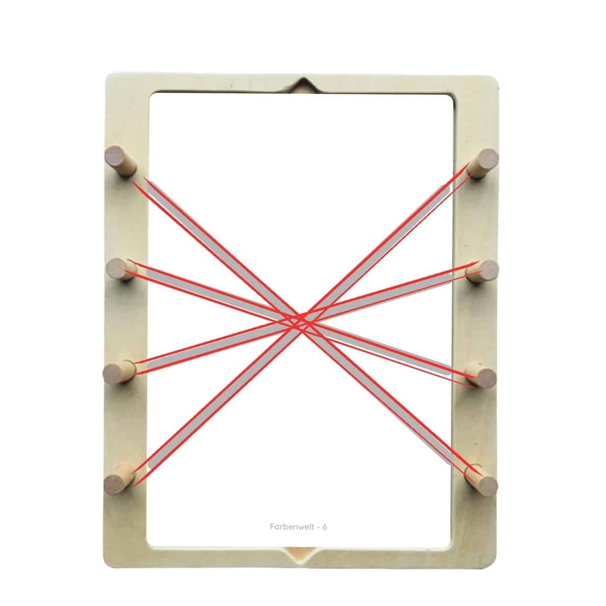 - Sobald Ihr alle Gummibänder gespannt habt, zieht die Karte heraus und dreht sie um. Schiebt sie wieder in den Holzrahmen, um die Rückseite mit der Selbstkontrolle zu sehen.