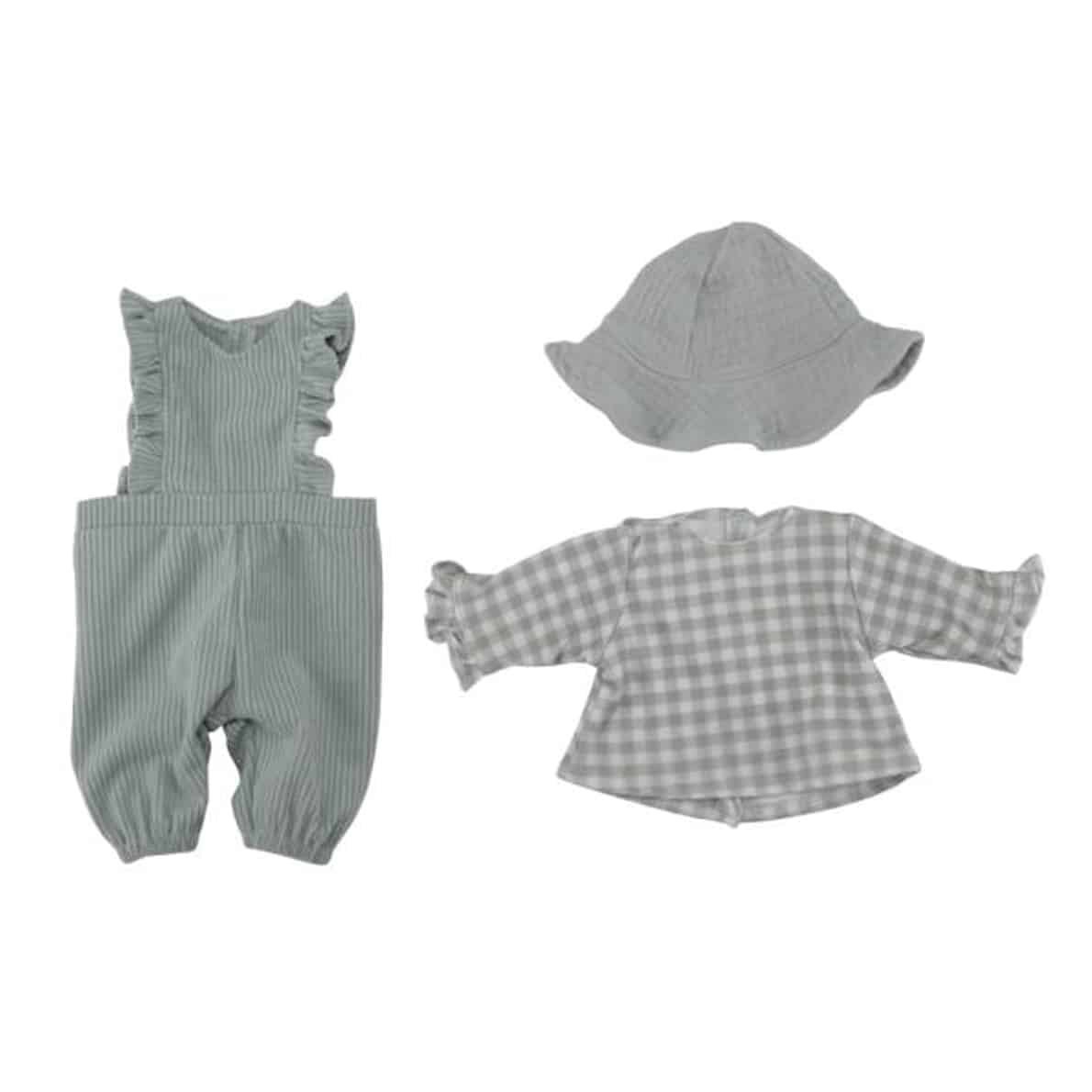 Was wird Eure Babypuppe heute tragen? Dieses bezaubernde Set ist perfekt für jede Gelegenheit. Viel Spaß beim Anziehen der Lieblingspuppe, damit Ihr gemeinsam für einen Tag voller Spielabenteuer bereit seid. Das Set besteht aus einer Latzhose mit Rüschen in einem zarten Grünton, die mit einem langärmeligen Hemd im frischen Karomuster kombiniert wird. Vervollständigt wird dieses niedliche Outfit mit einem süßen grünen Sonnenhütchen.