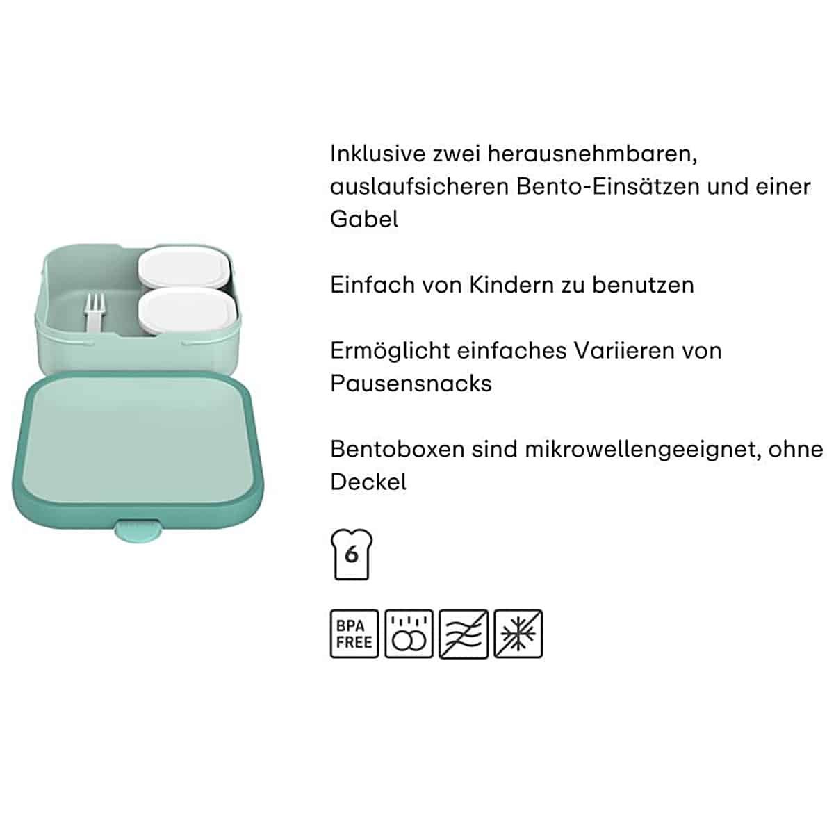 - Inklusive zwei herausnehmbaren, auslaufsicheren Bento-Einsätzen und einer Gabel