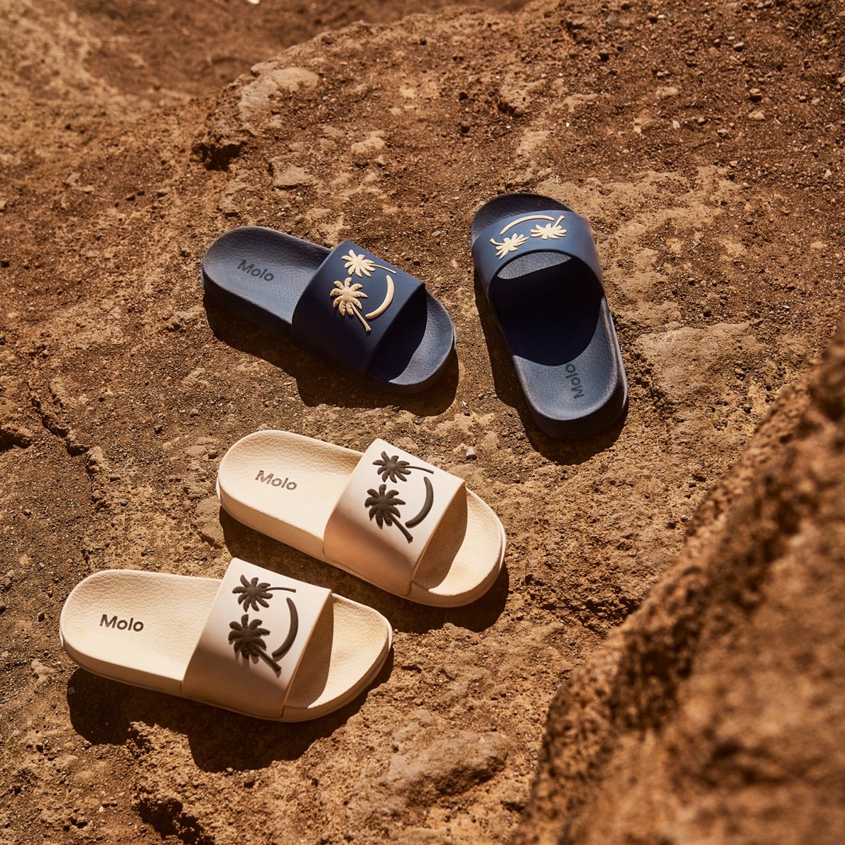 Dunkelblaue Badesandalen mit breitem Fußriemen und geformter Innensohle. Die Sandalen sind wasserabweisend, was sie perfekt für den Pool oder Strand macht. Der Fußriemen hat ein lächelndes rotes Gesicht. Die Größen 23/24 und 25/26 verfügen über einen praktischen elastischen Fersenriemen, der eine bequeme Passform gewährleistet.