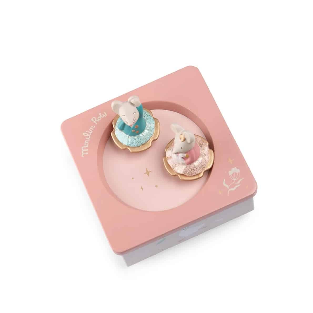 Eine nostalgische Spieluhr mit zwei kleinen Mäusen, die zu einer sanften Melodie tanzen und das Baby in den Schlaf wiegen. Ältere Kinder werden es lieben, den Mechanismus unter der Box selbst zu bedienen und den Figuren beim Tanzen zu zusehen.