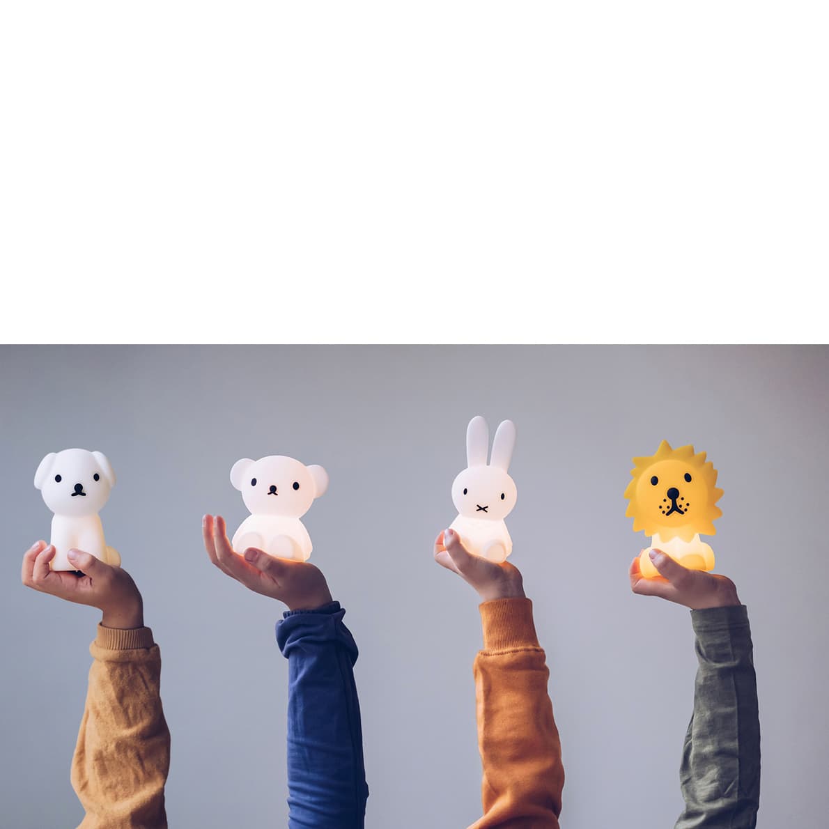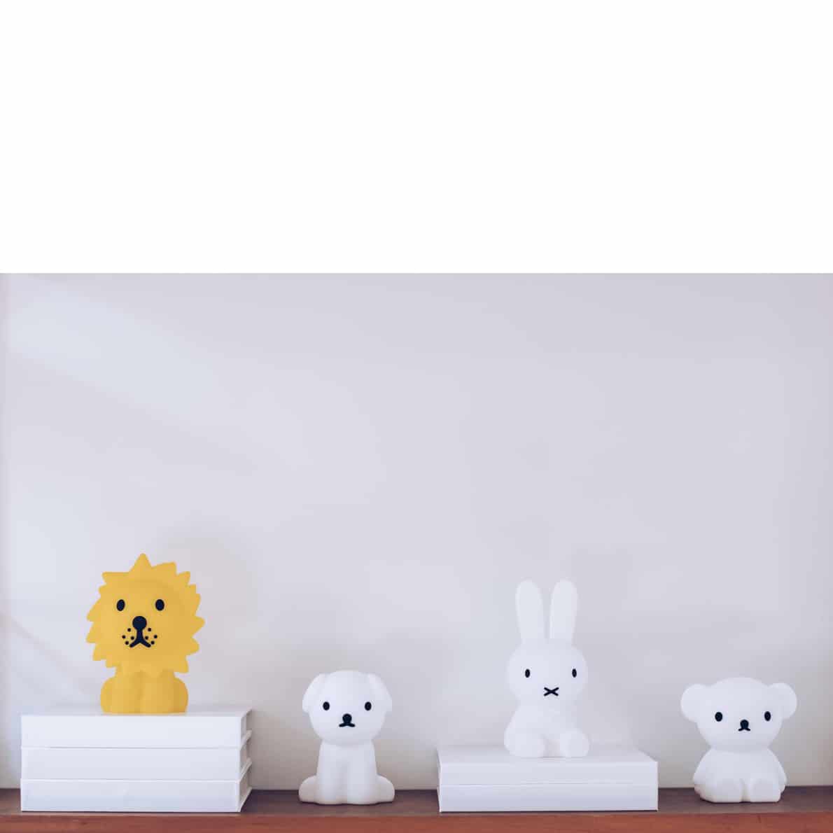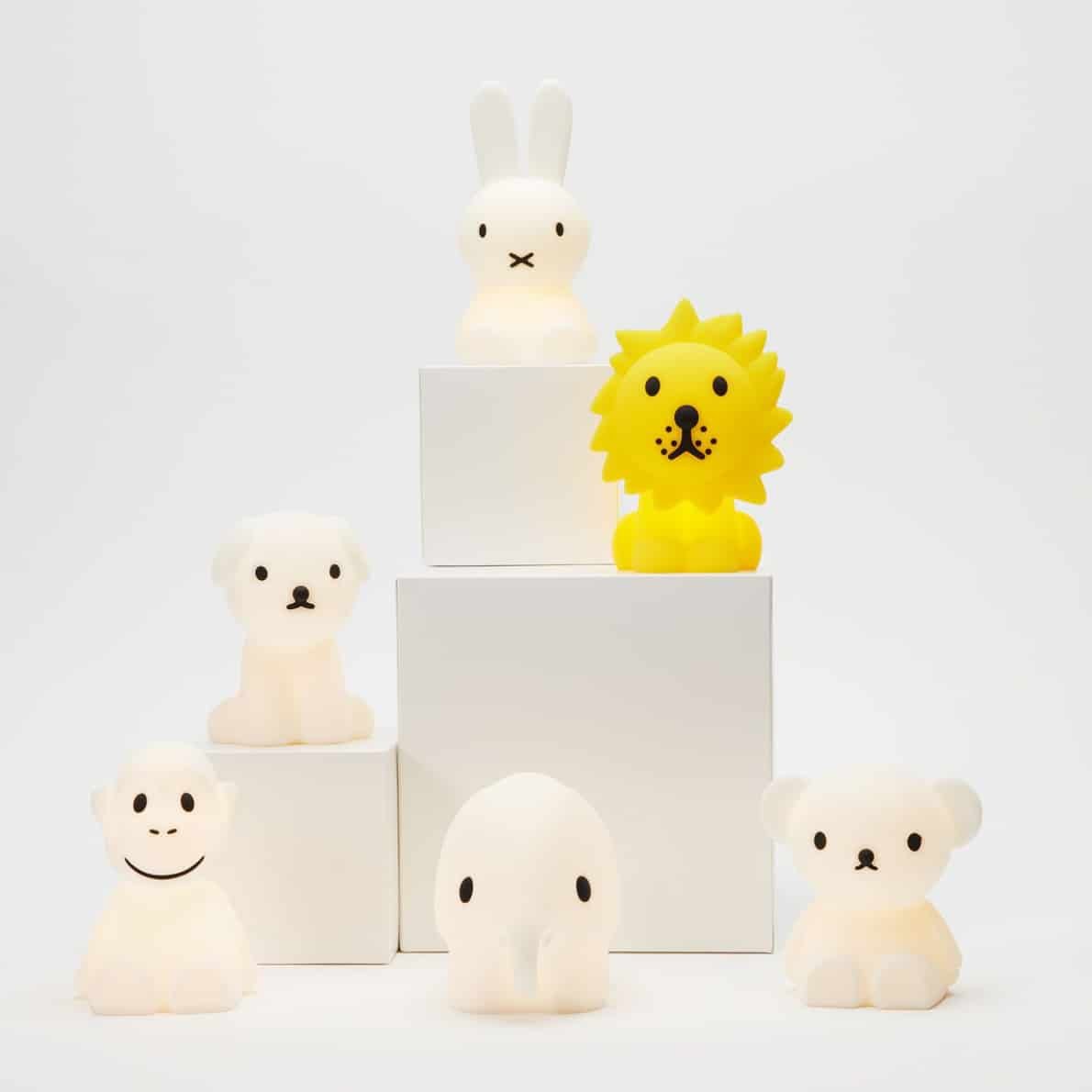 Die Mr Maria Bundle of Light sind da, um kleinste Momente zu beleuchten. Diese Mini Lichter in Form von Miffy (15 cm), Boris (10,2 cm) Snuffy (11cm), Elephant und Monkey (11 cm) und Smiley Pink (Durchmesser: 12 cm) sind die Lichtblicke des Tages! Sie bestehen aus weichem Silikon und werden mit einer Batterie geliefert, um das LED-Licht zu erleuchten.