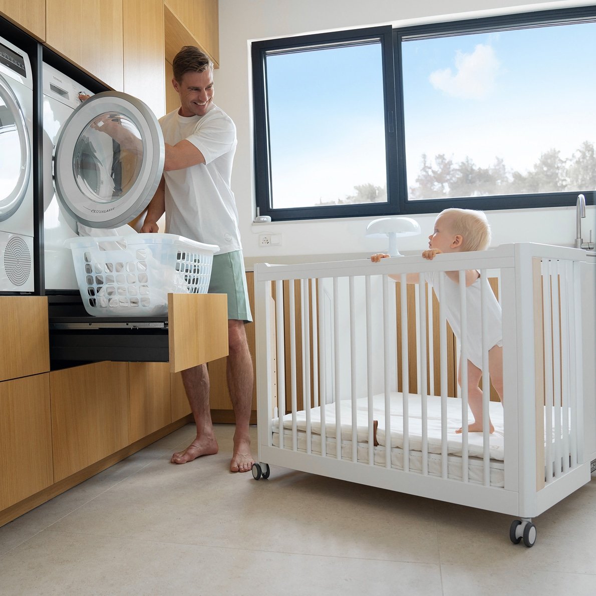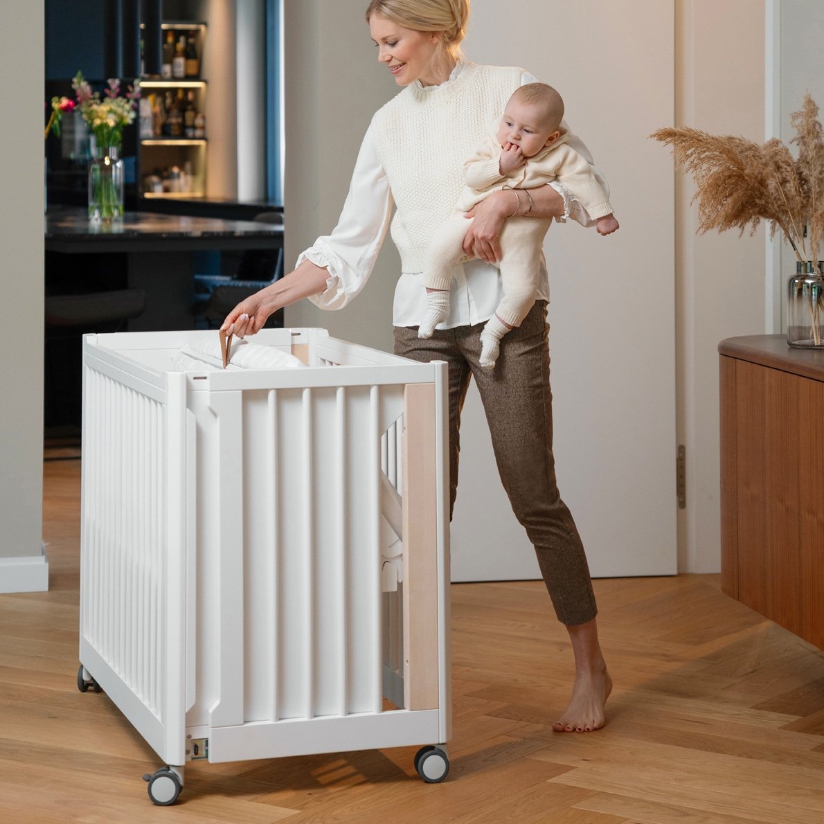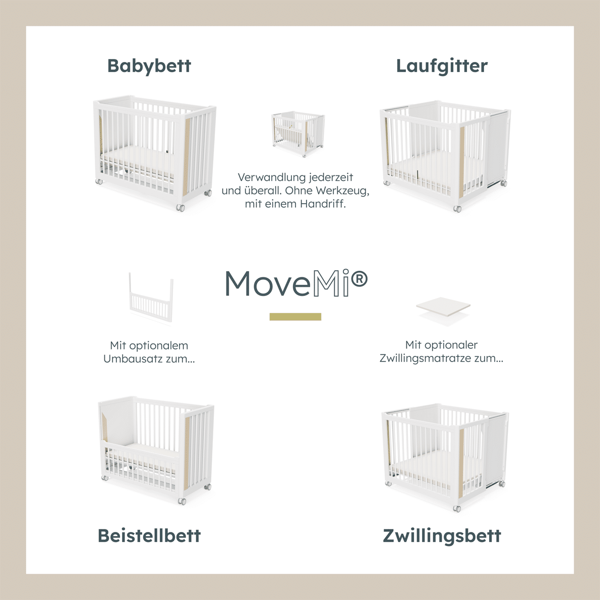 Das MoveMi® ist sowohl Babybett als auch Laufgitter – perfekt für moderne Familien, die Wert auf platzsparende und wandelbare Möbel legen. Dank der durchdachten Konstruktion lässt es sich leicht an unterschiedliche Bedürfnisse anpassen und kann in der Wohnung, dank den Rollen überall mithin genommen werden.