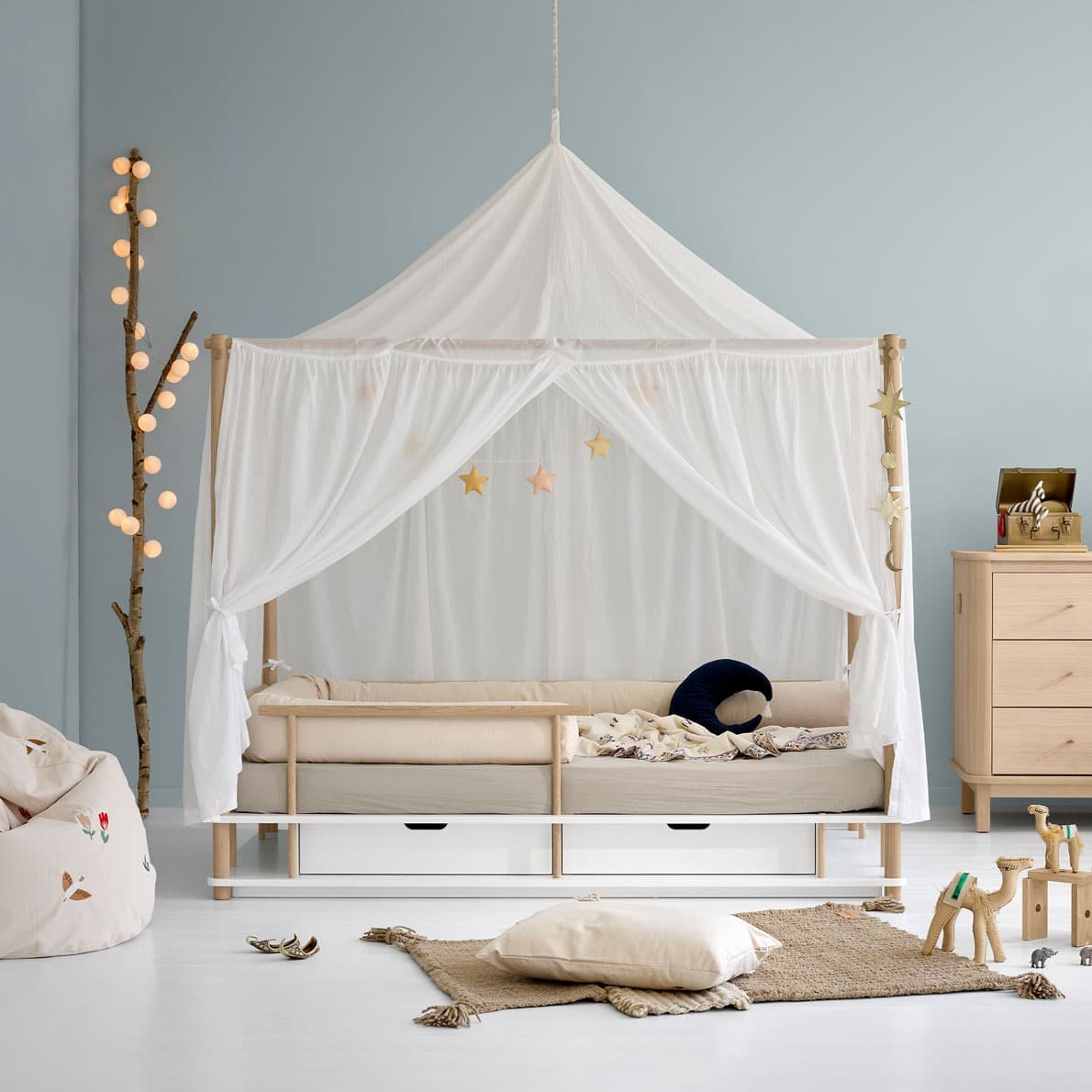 Dieser Rausfallschutz aus wunderschön geformten Eichenrundstäben passt sowohl zum Camp Himmelbett als auch zum Camp Bettsofa und ist kinderleicht zu montieren.