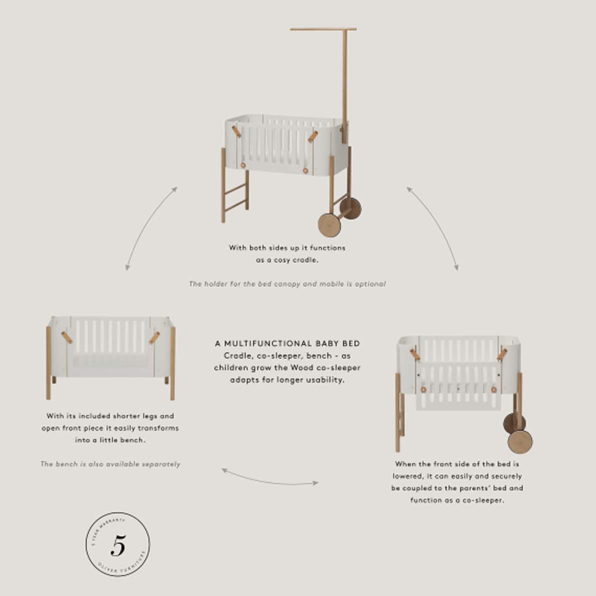 Wenn das Baby nach den ersten 6-9 Monaten ein anderes Bett braucht, kann das Wood Beistellbett mit den mitgelieferten Beinen und offenem Frontteil leicht in eine entzückende kleine Bank verwandelt werden. Die Bank ist höhenverstellbar und kann so das Kind noch über viele Jahre hinweg begleiten. Sie kann, genau wie das Beistellbett, sowohl im Schlafzimmer als auch im Wohnzimmer und in der Küche benutzt werden.