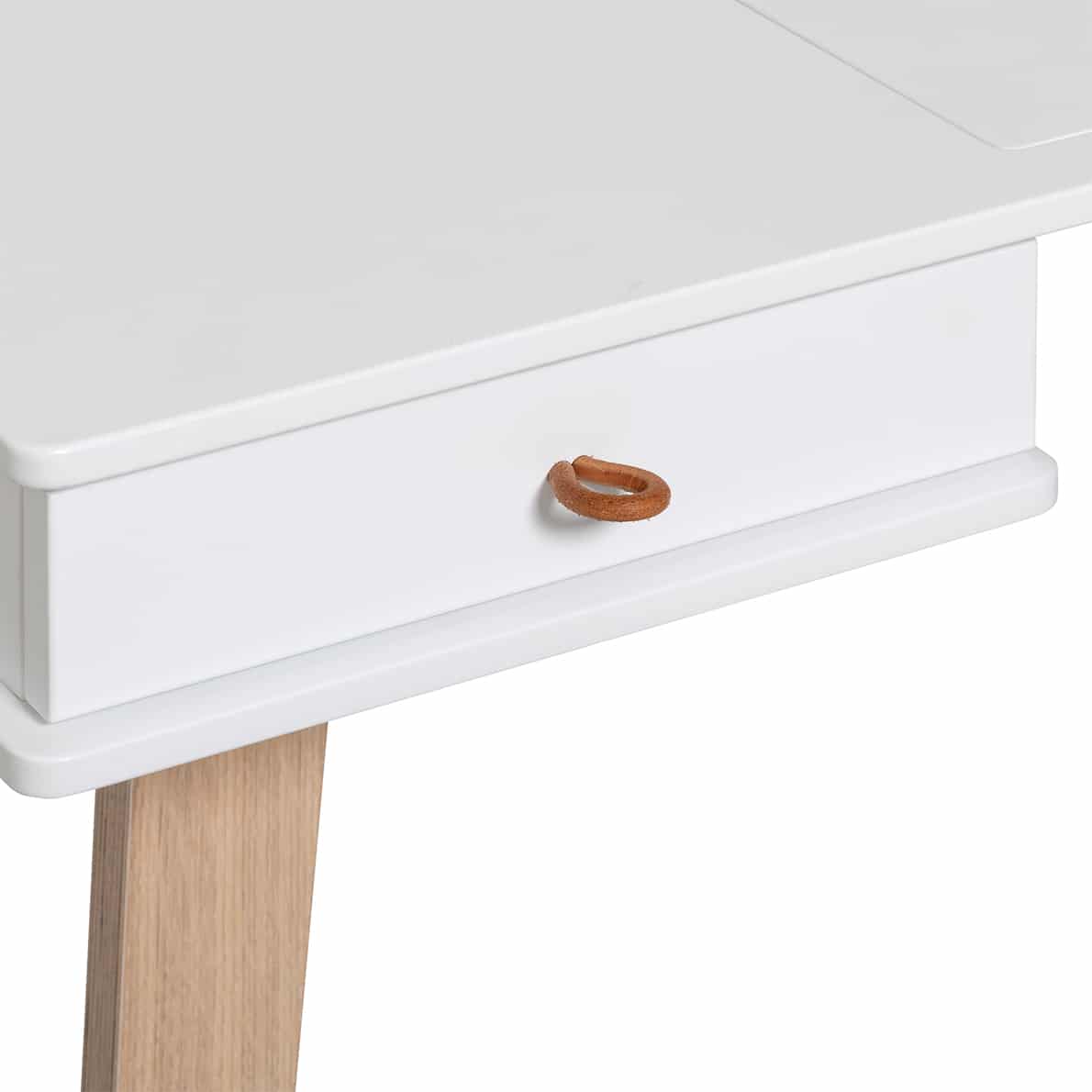 Wie die gesamte Wood Collection zeichnet sich auch der Wood Schreibtisch durch seine sorgfältige Verarbeitung und raffinierten Details aus. Die abgerundeten Ecken, auch an der der Wand zugewandten Längsseite, sorgen für optische Leichtigkeit, während Details wie die Ledergriffe der Schubladen und die leicht schräg abfallenden Beine, für die hohe Verarbeitungsqualität des Tisches stehen. Der stabile Schreibtisch aus weiß lackiertem MDF und weiß geöltem Eichenfurnier macht es mit seinem eleganten und leicht nostalgischen Design, zu einem Vergnügen seinen Gedanken, Meinungen und unzähligen Wörtern freien Lauf zu lassen.