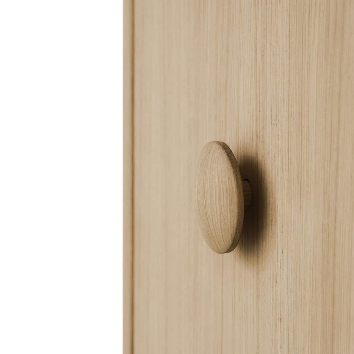 Die zwei runden Haken und den Sockel der Kommode gibt es sowohl in einer Ausführung aus massiver Eiche als auch in weißlackierter Birke. Zusammen mit den handgearbeiteten Ledergriffen unterstreicht dies die hohe handwerkliche Qualität der Möbel.