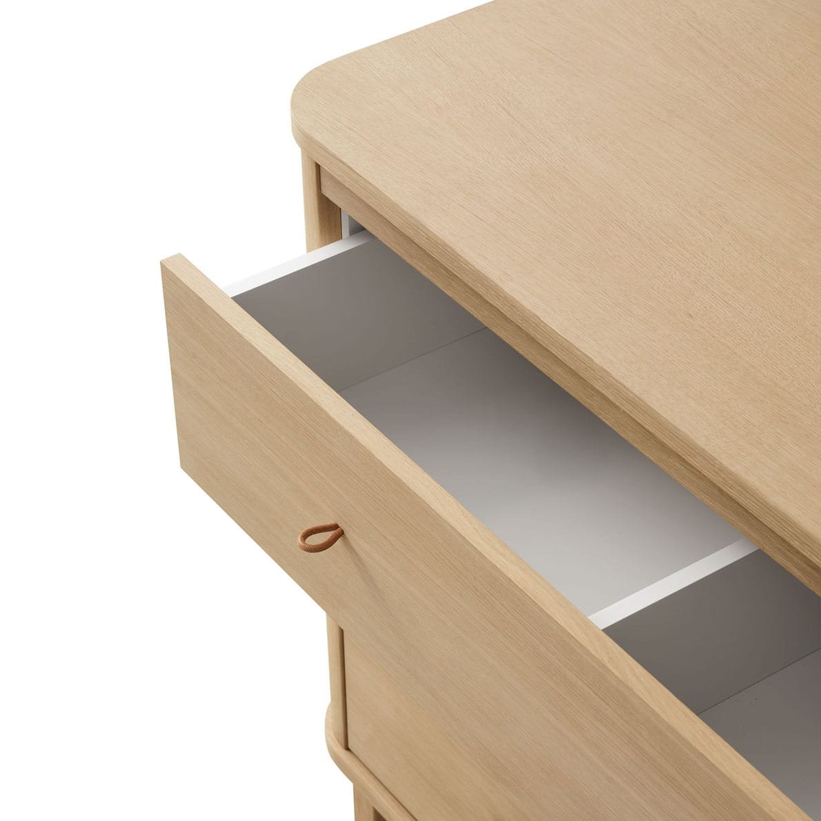 Die visuelle Leichtigkeit der Wood Wickelkommode wird durch ihre runden Formen erzeugt; sie weisen sowohl in den Raum also auch zur Wand hin. Die sechs soliden, großen Schubladen laufen auf qualitativ hochwertigen Schienen. Die ‚soft-lock‘-Funktion lässt die Schubladen langsam schließen, damit kleine Finger nicht eingeklemmt werden können. Das Design der Seiten ist mit runden Haken gestaltet, die man für dekorative Details nutzen kann oder um praktische Dinge schnell griffbereit zu haben.