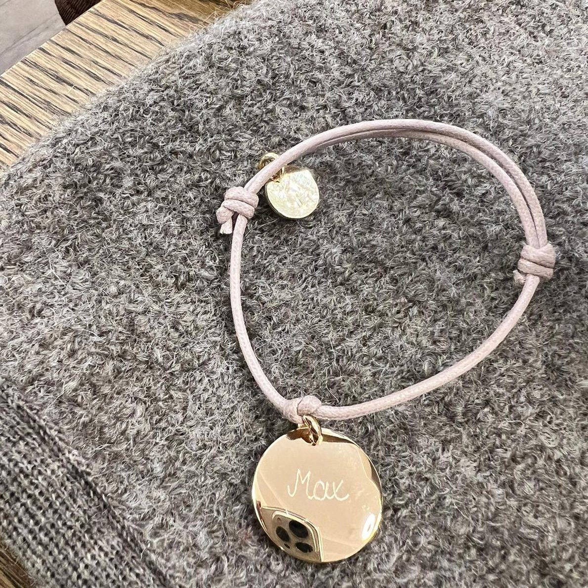 Das gewachste Baumwollarmbändchen hat die Farbe taupe und der Anhänger ist 18K gold plated und 20mm groß. Das Armbändchen ist individuell einstellbar, so dass die Größe in jedem Fall passen wird.