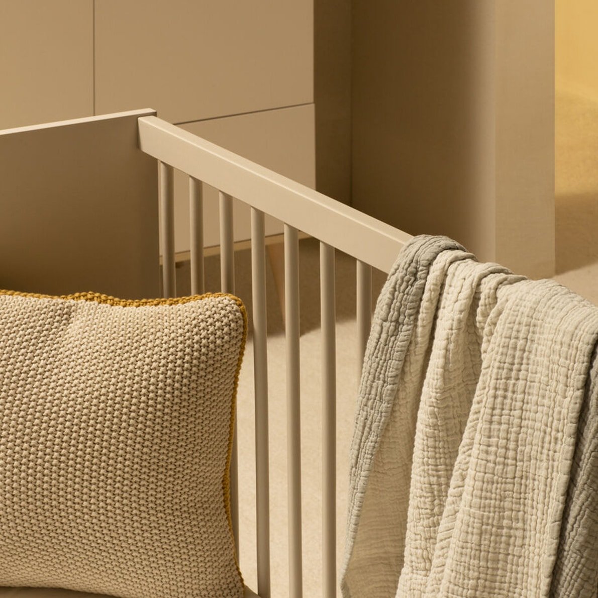 Die Quax Flow Möbelserie steht für ein reduziertes Design und beruhigende Erdtöne. Das wunderschöne, zeitlose Babybett mit vier massiven Buchenholzfüßen besitzt einen 2-fach höhenverstellbaren Lattenrost und ein Innenmaß von 70 x 140 cm.