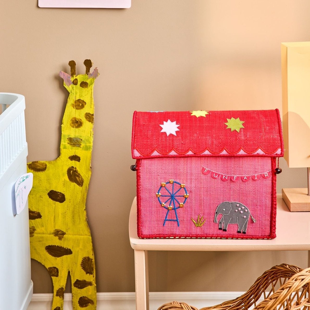 Auf zum Jahrmarkt! Die Rice Raffiahäuser mit Jahrmarktmotiv sind nicht nur eine tolle Ergänzung zum Spielen, sondern auch die perfekte Aufbewahrung für Spielzeug, Bücher, Decken und andere Dinge, die man nicht zeigen möchte. Also los – hüpft aufs Riesenrad, schnapp Euch eine Zuckerwatte oder dreh eine Runde auf dem Karussell.
