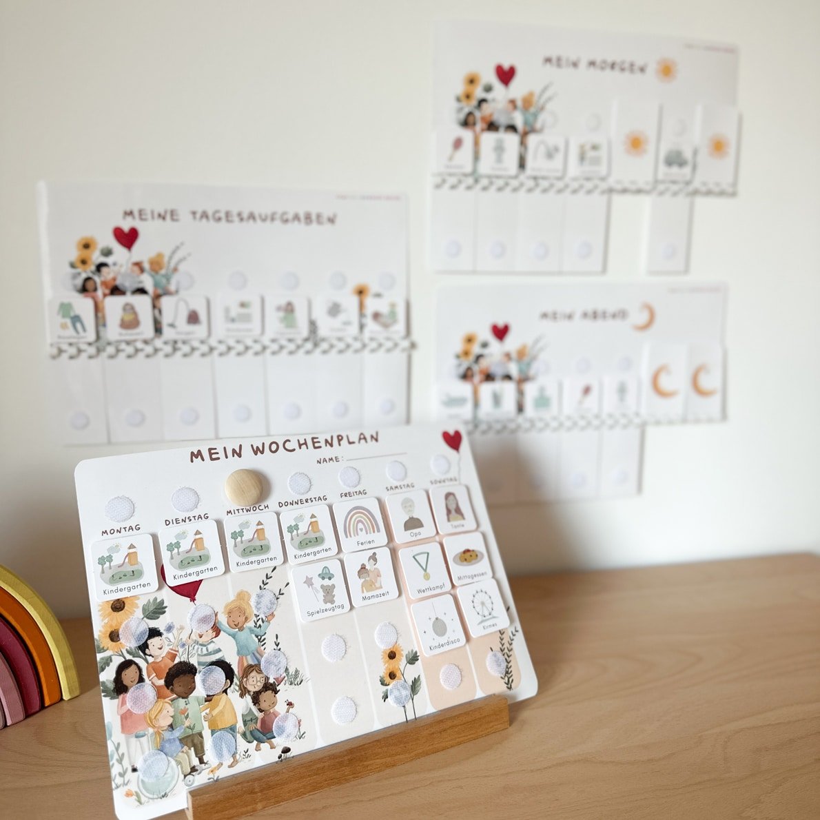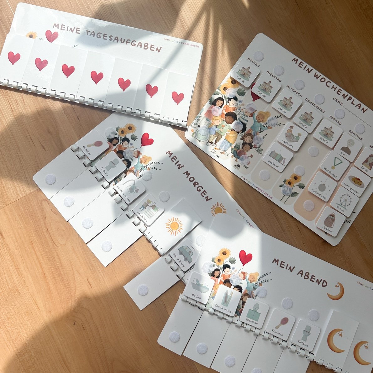 Das Routinchen Wochenplan-Set inkl. den 3 Routineplänen “Mein Morgen”, “Mein Abend” und “Meine Tagesaufgaben”sind speziell für Kinder entwickelt worden, um den Familienalltag spielerisch zu strukturieren und stressfreier zu gestalten. Inspiriert von den Prinzipien der Montessori-Pädagogik fördern sie die Selbstständigkeit und Eigenverantwortung Eures Kindes. Mit einfachen, kindgerechten Symbolen und Farben unterstützen die Planer Euer Kind dabei, tägliche Aufgaben, Aktivitäten und Routinen eigenständig zu meistern. So entsteht ein harmonischer Tagesablauf, der nicht nur das Kind stärkt, sondern auch Dir als Mama und/ oder Papa mehr Gelassenheit schenkt. Unser Ziel: Ein organisierter Alltag, der Raum für gemeinsame Zeit und Entfaltung bietet – für die ganze Familie.