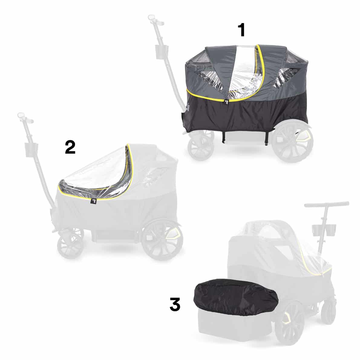 Trocken bei jedem Abenteuer! Mit der Veer Cruiser All-Terrain-Wetterabdeckung könnt Ihr Eure Passagiere bei Regen, Schnee und Wind warm und trocken halten. Mit dem 3-in-1 Design erhaltet Ihr versenkbaren Schutz, um 1 oder 2 Passagiere und / oder den hinteren Korb abzudecken.