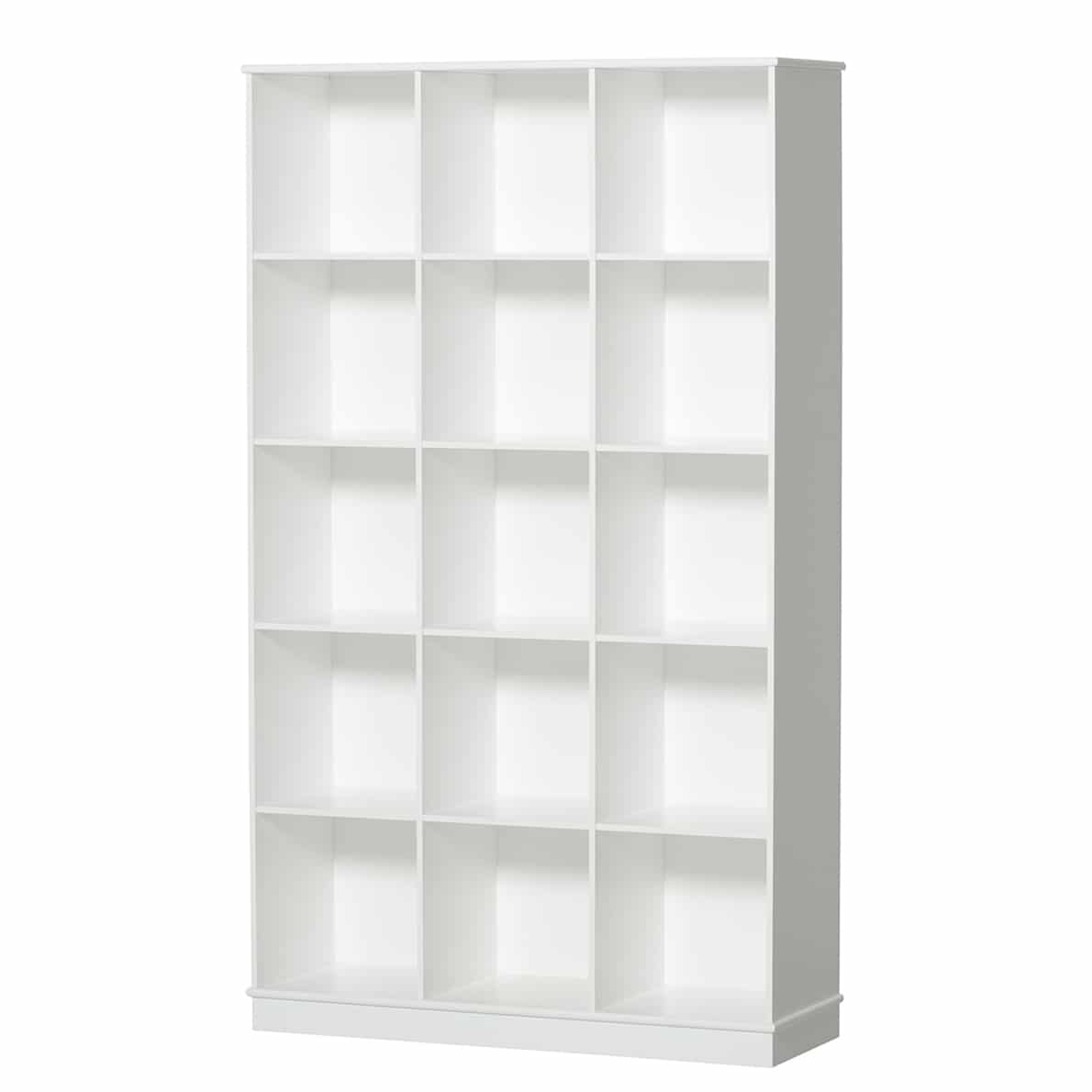 Hohes großes Regal in nordischem Design. Dieses Kastenregal steht auf einem Sockel und hat 15 Fächer – 3 waagerecht und 5 senkrecht übereinander. Es ist damit das größte der Oliver Furniture Regalserie in der Wood Collection. Es bietet viel Aufbewahrungsplatz, sowohl im Kinderzimmer wie auch in allen anderen Zimmern im Haus. Durch sein klassisches stilechtes Design fügt sich das Regal harmonisch in zahlreiche Räume und Einrichtungsstile ein. Noch mehr Ordnung im Regal kann durch zusätzliche Aufbewahrungskästen erreicht werden; außerdem können weitere Regalbretter, die die Fächer weiter unterteilen, zugekauft werden. Die Aufbewahrungskästen sind wendbar und haben auf jeder Frontseite einen Ledergriff, dabei ist eine Frontseite weiß und eine aus Eichenholz. Das Wood Kastenregal ist nachhaltig in Europa produziert, es ist langlebig, stabil und von hoher Qualität.