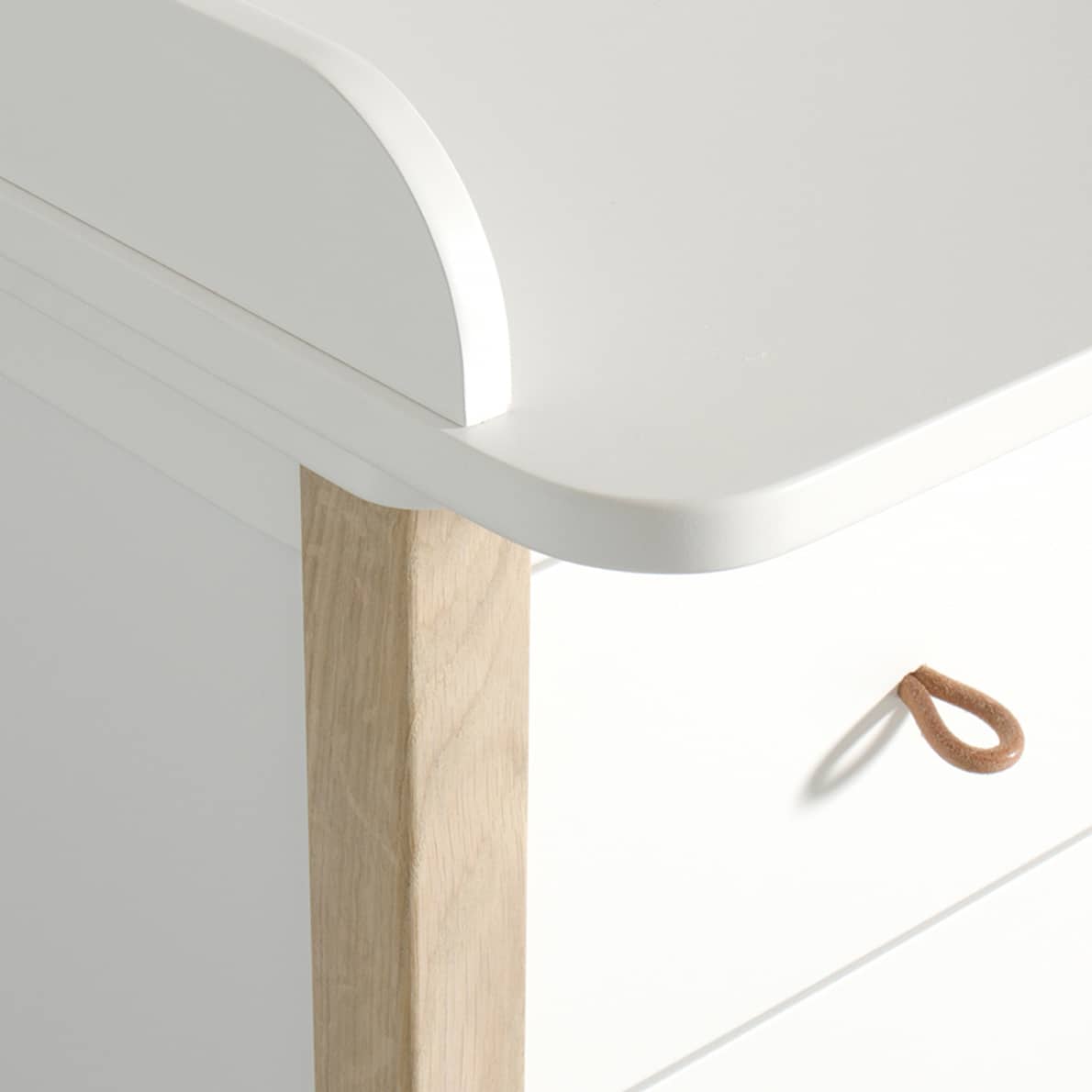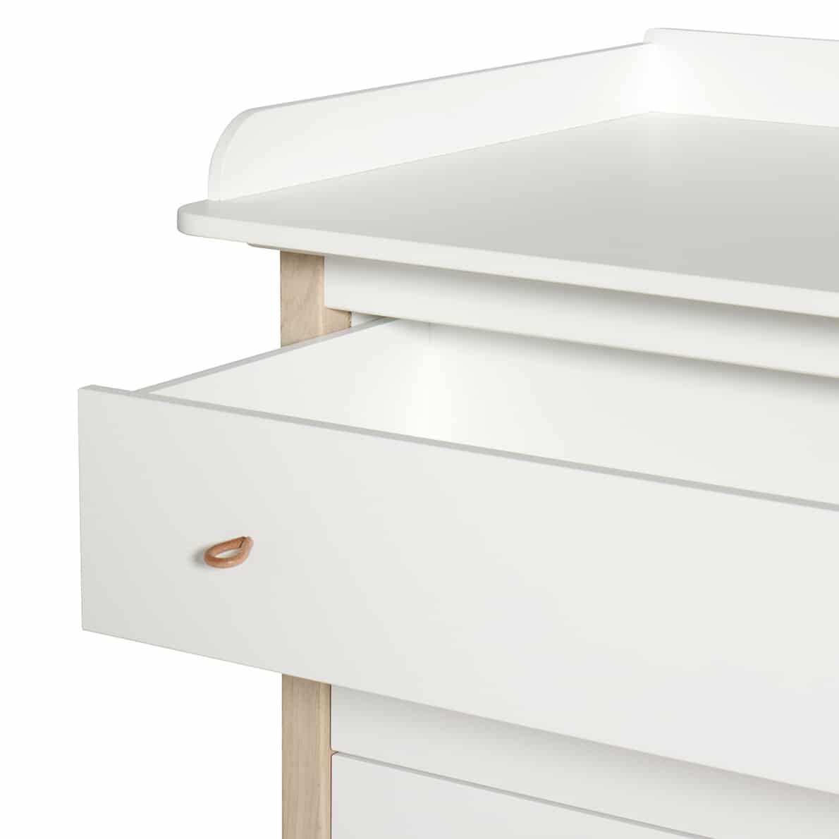 Die neue Wood Wickelkommode besticht durch Ästhetik, hochwertiges Handwerk und funktionell ausgerichtetes Design. Nordische Eiche trifft auf weiße klassische Linien. Die Lederriemen als Schubladenknäufe und die durchgehenden Eichenholzbeine ergänzen das natürliche Design.Die vier geräumigen Schubladen sind auf hochwertigen Schienen montiert, die mit ’soft lock‘ schließen. Eine große Wickelplatte ermöglicht eine bequeme Pflege des Babys. Funktionalität, Form und Qualität ergänzen sich zu einer höheren und langlebigeren Einheit. Wenn die Platte nicht mehr benötigt wird, kann sie einfach abgenommen werden und Ihr habt nun eine coole zeitlose Kommode.